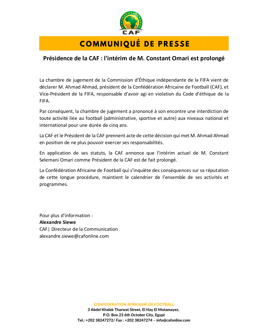President De La Caf Actuel : Caf Le President Interimaire Constant Omari Prolonge / Présidence de la caf :